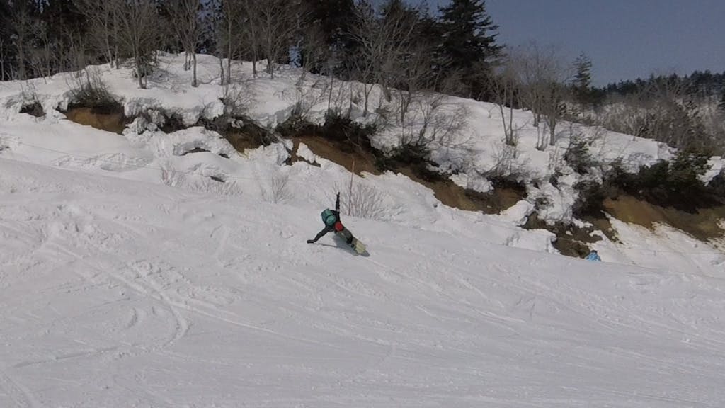 後ろ足を踏み込んでボードがフラットになり、Cの部分よりノーズにかけて緩く雪面から浮き上がる。これによりボードの下を流れる雪との抵抗を極端に減らすのだ。
